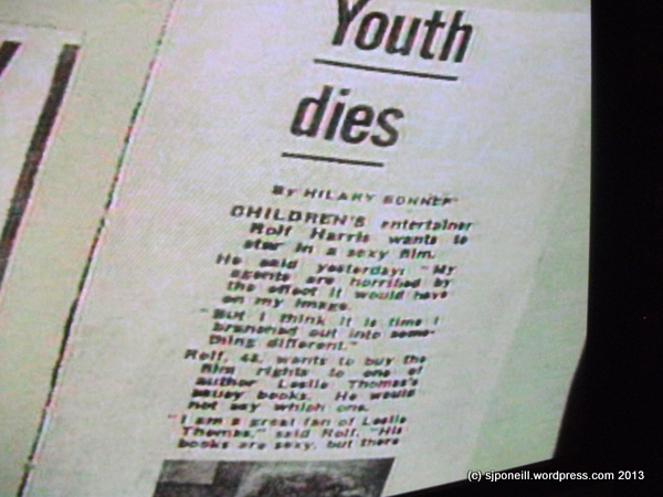 While we were watching The Professionals, we caught this bit of unintentional humour. The plot involved an article on the other page but we spotted this about Rolf Harris’ ambition “…to star in a sexy film…” Possibly a bit regrettable today in the light of the ongoing arrests of entertainment stars from that era for a range of offences with young girls…