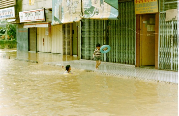 I got back as far as 1988 before I found this one which happily conbined both…two children playing in flood water in downtown Kota Bahru around September 1988 as we staged for the Great Thailand-Singapore Amphibious Cycle Ride – the amphibious bit being unplanned but necessary: next time we probably wouldn’t plan such an event to sync with the first week of the monsoon…